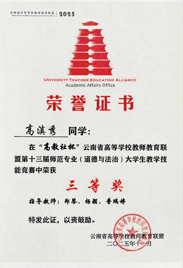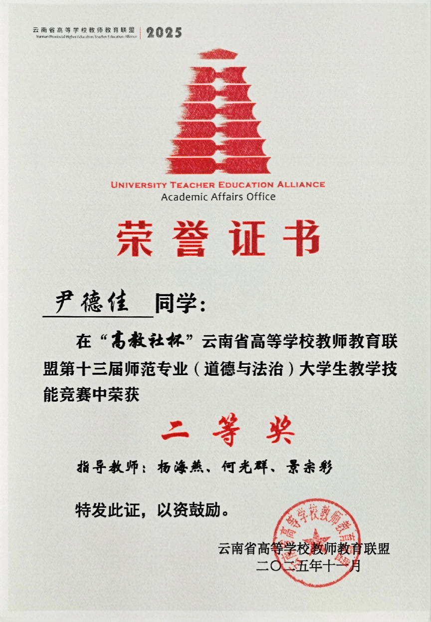 在2025年11月举办的“高教社杯”云南省高等学校教师教育联盟第十三届师范专业(道德与法治)大学生教学技能竞赛中,我院思想政治教育专业喜获佳绩。22级思政专业尹德佳、于水青分别获得二等奖,高滇秀同学获得三等奖。我院参赛同学在比赛中彰显了扎实的专业功底,为学院和个人赢得了荣誉。